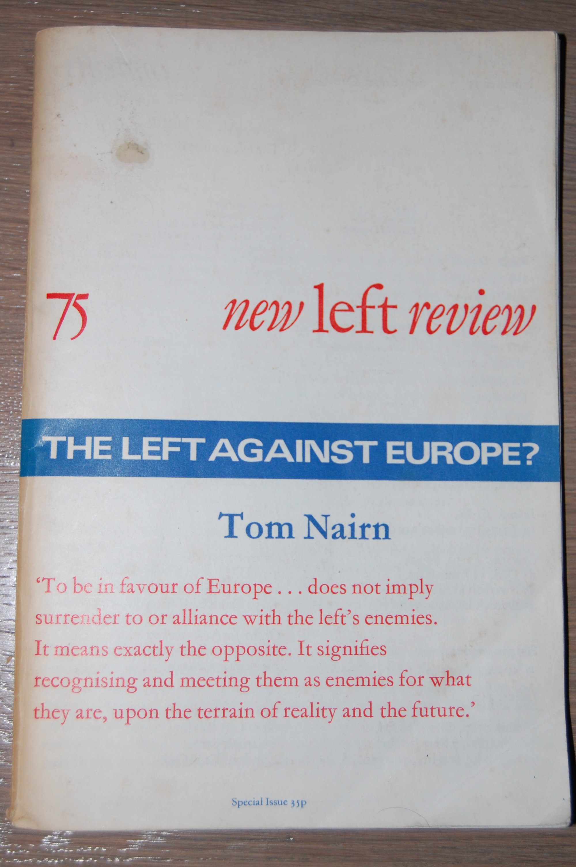 When I was in a second hand bookshop in Glasgow some weeks ago my attention was therefore drawn to an old copy of New Left Review from 1972, which was a special issue on ‘The Left Against Europe’.  The whole issue was devoted to one article written by Tom Nairn on the ‘great debate’ in Britain in the previous year whether Britain should join the Common Market, as the EEC was popularly called.  This debate eventually led to a vote in the Westminster Parliament to join and accession into membership in 1973, before the new Labour Government elected in 1974 held a referendum in 1975 to ratify staying in.