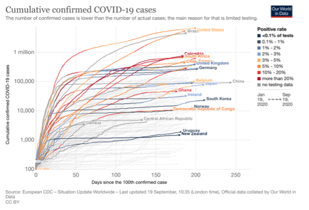 The following graphs show first, the daily new cases, and the following two graphs the cumulative total cases and death rate per million for a number of different countries.