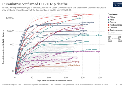 The third shows that the increase in the number of deaths has slowed even more than cases and the lines in the graph have flattened considerably.  The point is not comparison between countries but the common pattern of reduced growth of both cases and especially deaths over the whole period of the pandemic.  The first graph shows that this is the situation while cases have and may continue to increase in a range of countries.