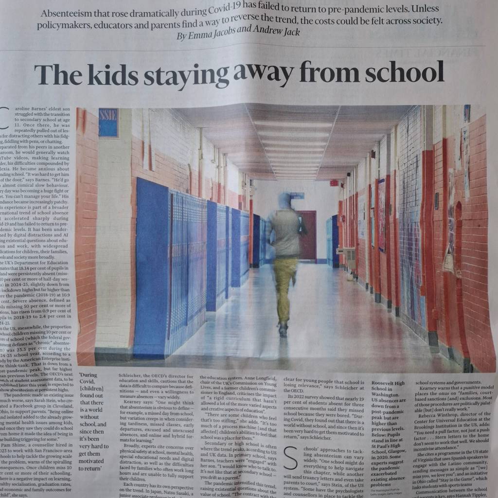 Other effects are still with us. ‘The response to the Covid pandemic entailed the most extensive and lengthy disruption to education in history.’ (In Covid’s Wake, p187). In the US, and elsewhere, school closures continued long after it was clear, if it was not already clear from the start, that schools did not drive transmission. It has led to a continuing significant increase in absenteeism from school with long lasting damage to the children involved and to wider society.