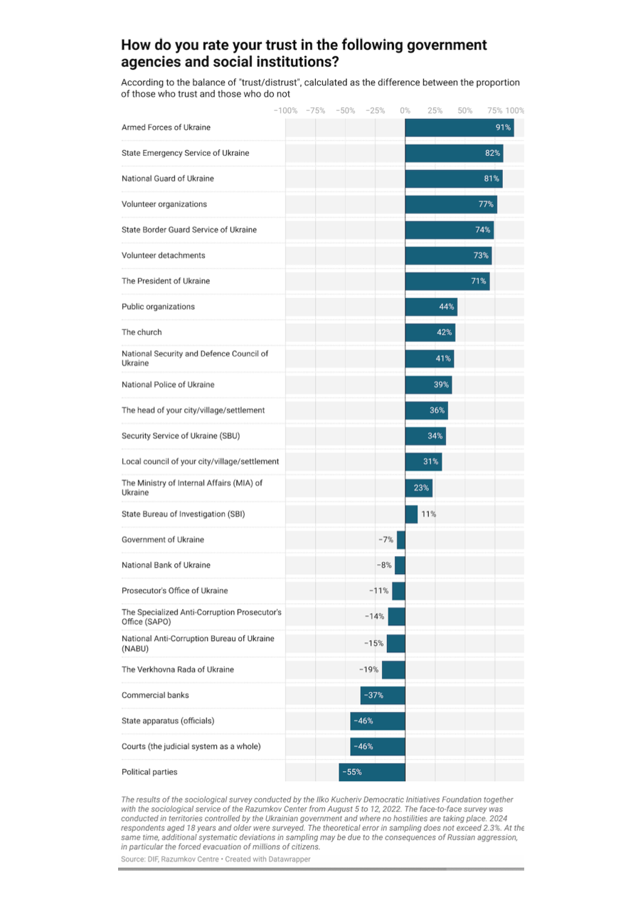 The highest support is for the armed and security forces of the state, the most common expression of war in any country. Support for the President is also high. Support for other organisations is much lower and when it comes to the state bureaucracy, courts and political parties it becomes strongly negative. The expressions of hope among the majority of Ukrainians recorded in another opinion poll are not new; they have been raised many times before in the recent past, including, for some, after the Orange Revolution in 2004 and the Maidan uprising in 2013/2014, plus the elections of various Presidents including Zelensky.