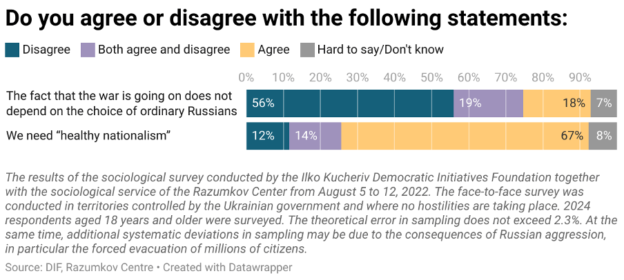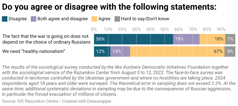 ‘. . . the question arises, what can be considered a victory? The majority of respondents (55%) say that the withdrawal of Russian troops from the entire territory of Ukraine and the restoration of borders as of January 2014 can be considered a victory. Another 20.5% are even more radical – a victory in the war for them would be the destruction of the Russian army and assistance to the revolt/breakdown inside Russia. A relatively small proportion of respondents would consider the end of the war with some kind of concessions from Ukraine a victory. About 9% would consider the withdrawal of Russian troops from all of Ukrainian territory except occupied Crimea a victory, 7.5% would consider the restoration of the status quo as of February 23, 2022.’