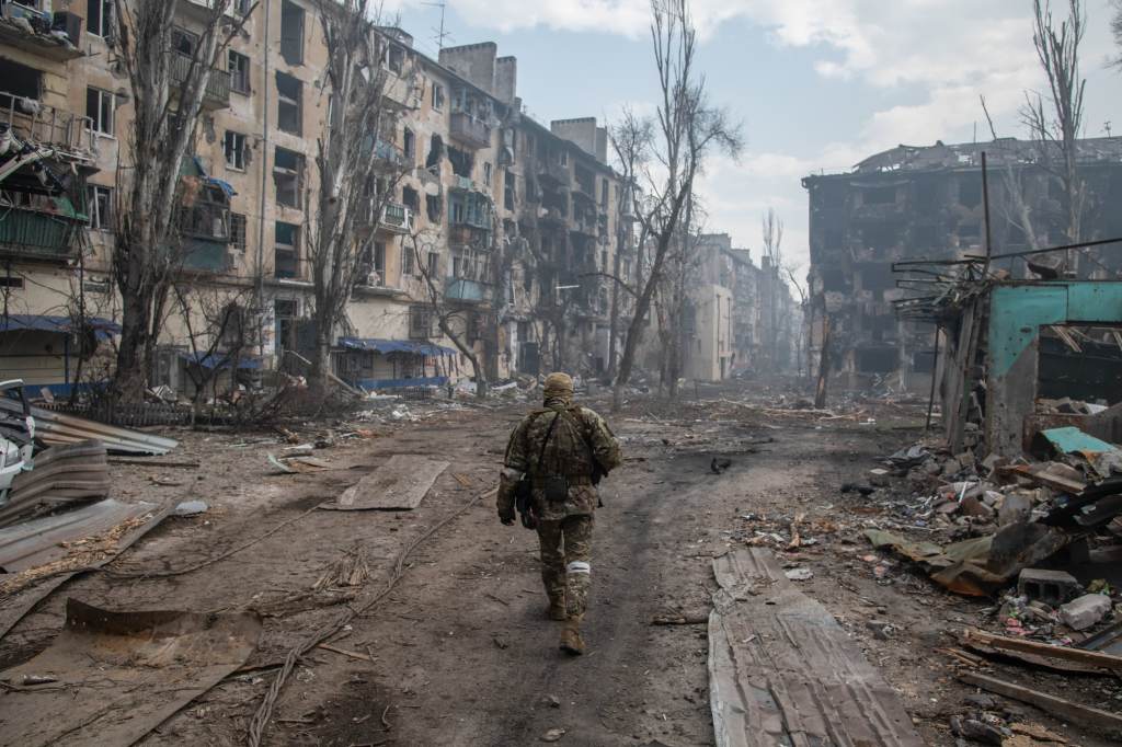 A Russian soldier walks in the rubble in Mariupol’s eastern side, where fierce fighting takes place between Russian and pro-Russia forces and Ukraine on March 15, 2022.